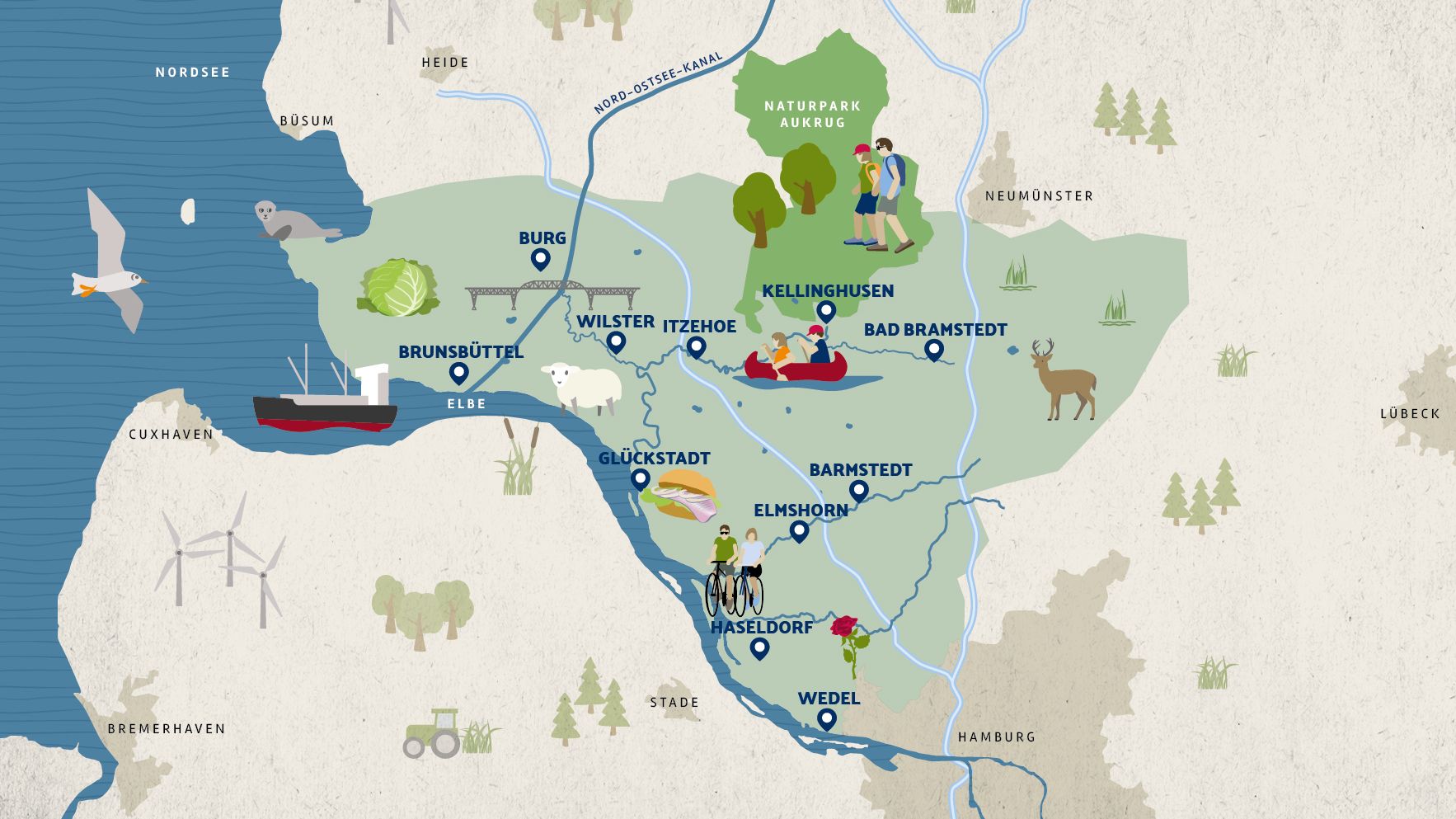 Jo, Holstein ist ein Teil des echten Nordens. Zwischen Nordsee und Hamburg erstreckt sich entlang der Elbe ein wunderschöner Landstrich, der alles hat, was du für eine erholsame Auszeit brauchst. Bezaubernde Städte und hübsche Ortschaften, umgeben von grünen Wiesen und Wäldern und dazwischen ganz viel Wasser, machen Holstein zu einem besonderen Fleckchen Erde. Und das Beste daran sind unsere netten und bodenständigen Menschen, die immer für einen Klönschnack zu haben sind und dich mit unseren leckeren regionalen Produkten kulinarisch verwöhnen – ob süß oder herzhaft – sie gehören zu Holstein wie der Wind zur See.