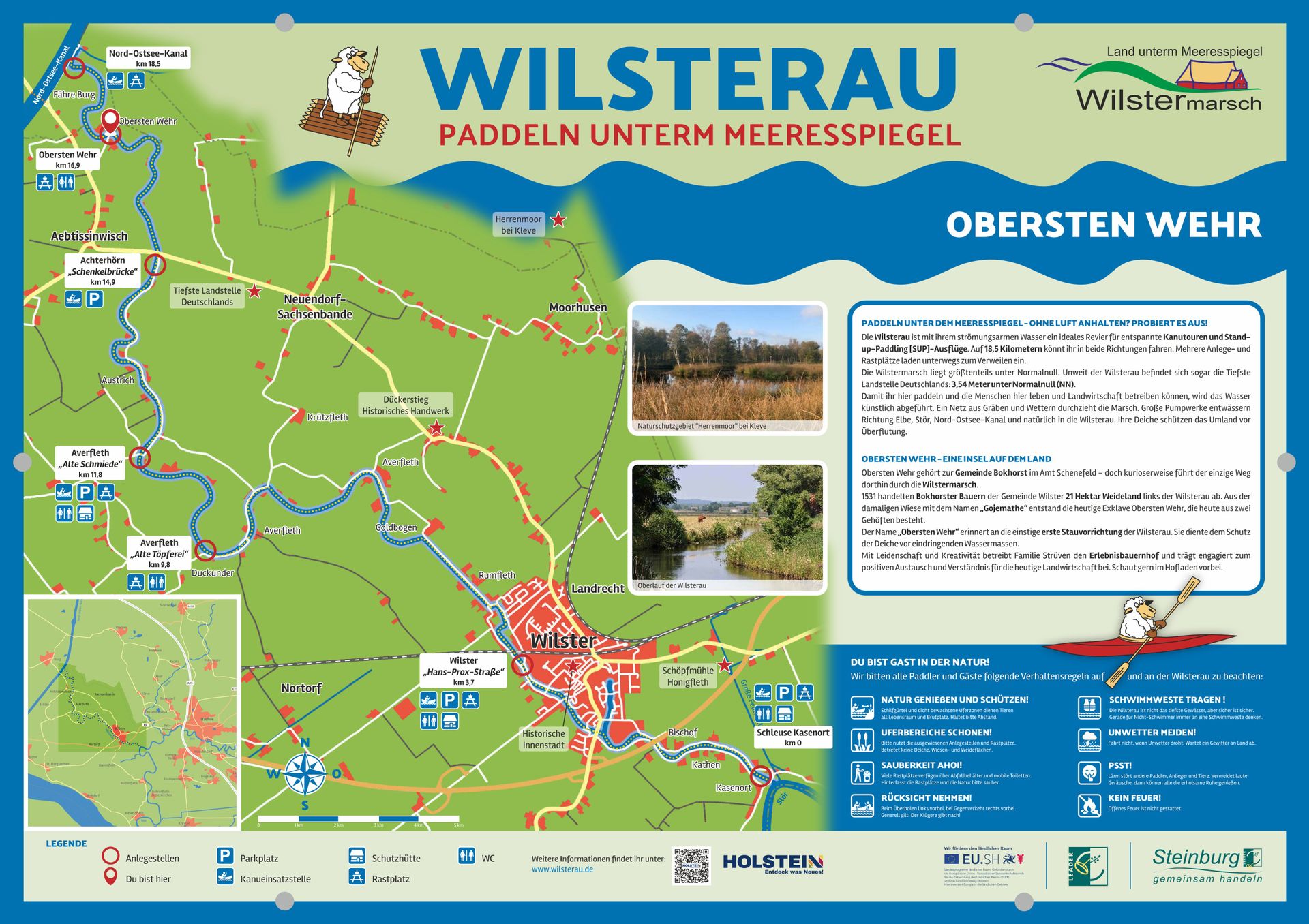 Die Kanueinsetzstelle am Obersten Wehr liegt idyllisch auf halber Strecke zwischen dem Kanuverleih „Wilsterau-Kanu“ in Achterhörn und dem Nord-Ostsee-Kanal – ein perfekter Ort für einen Zwischenstopp. Besonders für Familien mit Kindern lohnt sich eine Rast: Direkt am Erlebnishof Strüven gelegen, erwartet dich ein liebevoll gestalteter Platz mit zahlreichen Angeboten für Spiel, Entspannung und Genuss. Eine Schutzhütte, Sitzplätze und Parkmöglichkeiten sorgen für Komfort – egal ob bei Sonnenschein oder plötzlichem Regenschauer.