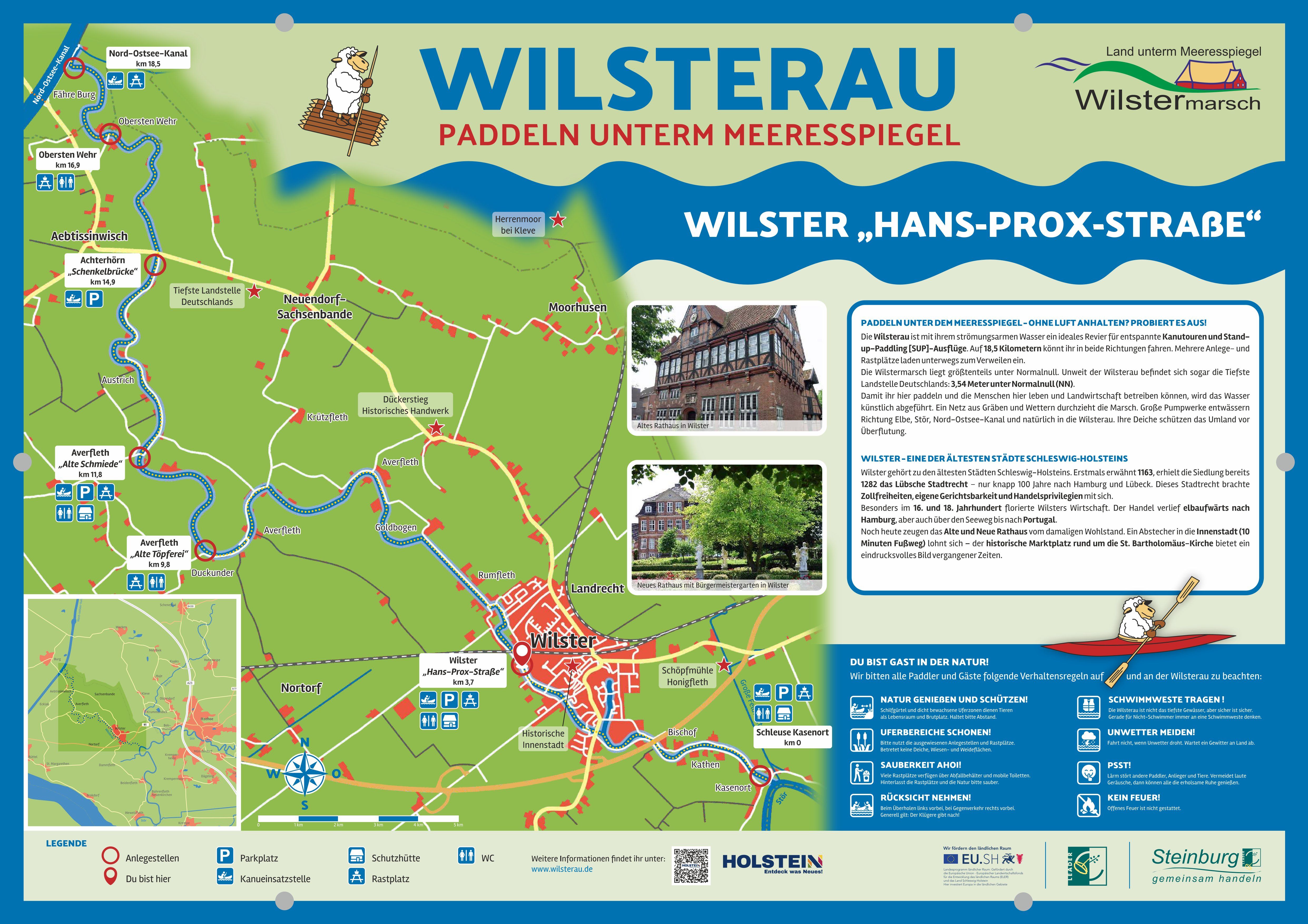 Der Kanuanleger in Wilster liegt nur wenige Schritte von der Innenstadt entfernt – ideal für alle, die ihre Tour auf der Wilsterau starten, unterbrechen oder beenden möchten. Die Einstiegstelle ist großzügig und gut ausgebaut, sodass Ein- und Ausbooten bequem möglich ist. Auch für eine Pause bestens geeignet: Gastronomie und Einkaufsmöglichkeiten sind fußläufig erreichbar. Ob als Ausgangspunkt oder Zwischenstopp – der Anleger in Wilster verbindet Komfort mit Stadtflair.