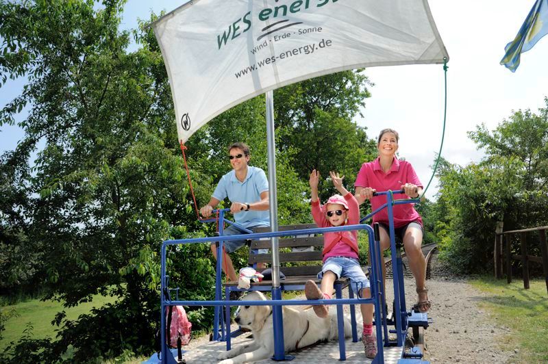 Bis zu vier Erwachsene oder Familien mit zwei Erwachsenen und bis zu drei Kindern, je nach Alter, haben auf der Draisine Platz. Auch dein vierbeiniger Freund kann gerne eine Tour mitmachen!