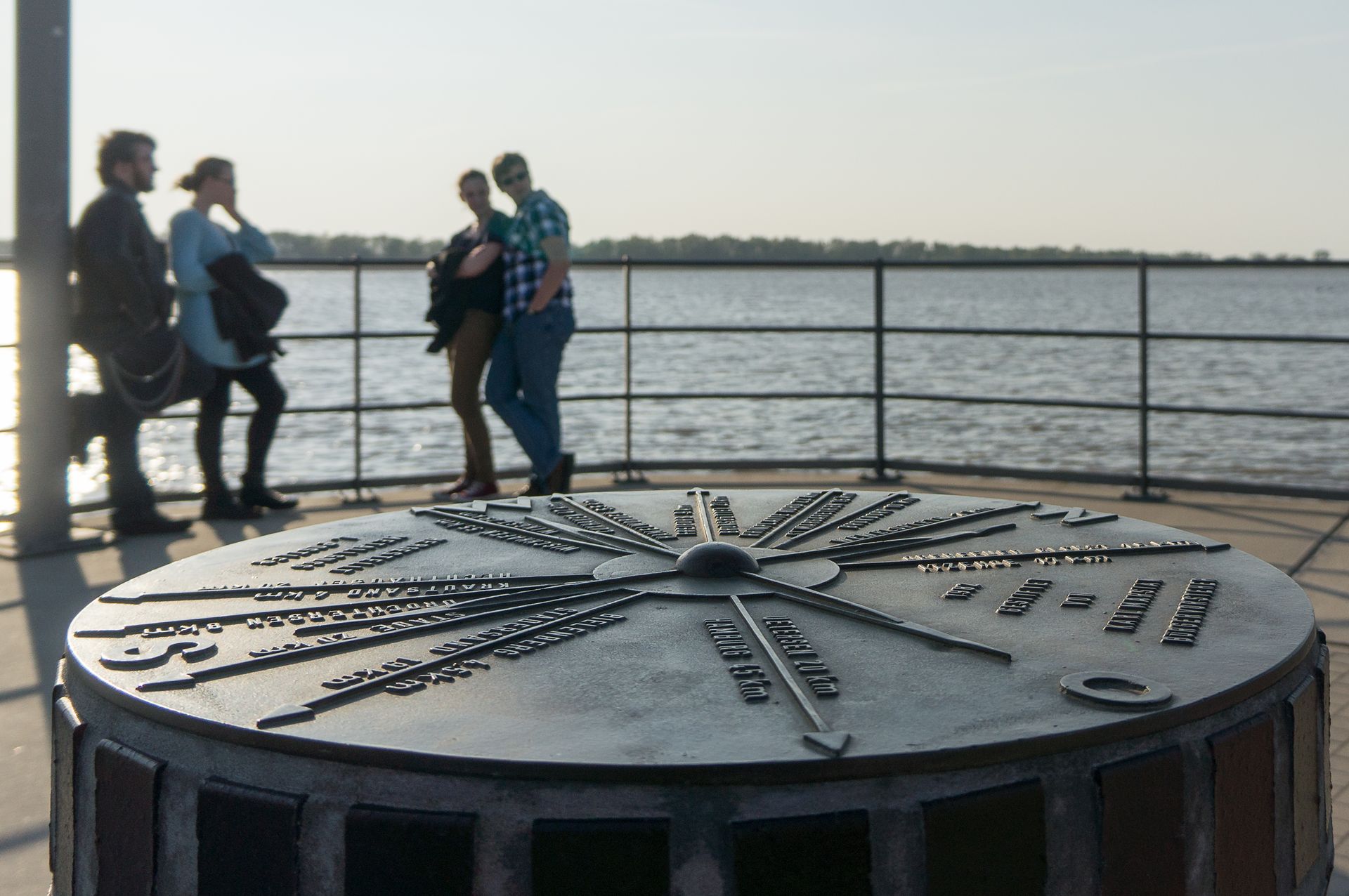 Zwei Personen sitzen auf einem Geländer und genießen den Sonnenuntergang über der Elbe. Der Himmel ist in warmen Farben getaucht, das Wasser spiegelt das Licht.